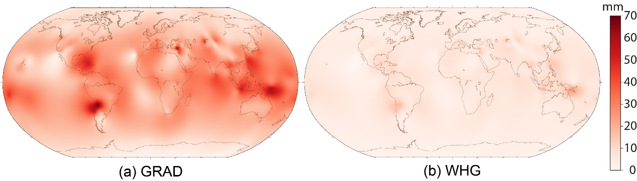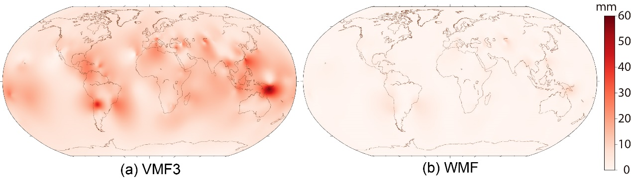 The model products primarily consist of three categories: mapping function product (WMF), horizontal gradient products (WHG), and comprehensive empirical model (WTM). Among them, the mapping function and horizontal gradient products target post-processing high-precision applications, while the comprehensive empirical model addresses real-time applications. As of now, the research group has developed site-wise model products covering the globally distributed 1,583 space geodetic stations, including those of the Crustal Movement Observation Network of China (CMONOC) and the National BDS Augmentation Service System. Corresponding grid-wise model products are still under construction (marked by a gray background).